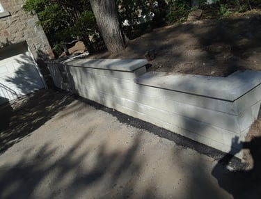 Completed retaining wall project featuring clean, smooth concrete blocks with precise capstones, fully backfilled, properly drained, and stabilized delivering enhanced stability, erosion control, and a polished, professional finish to your Montreal property.